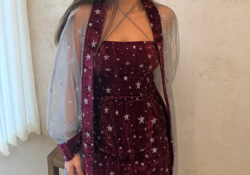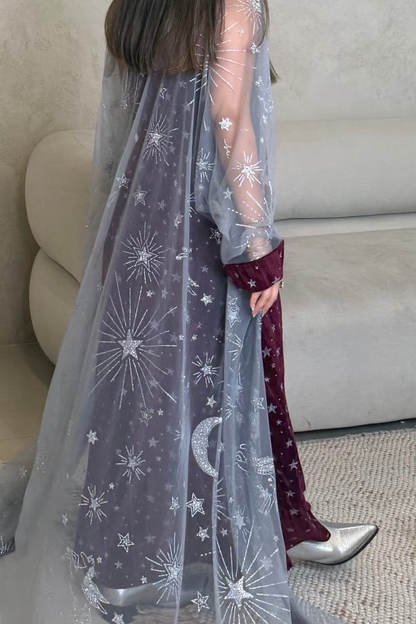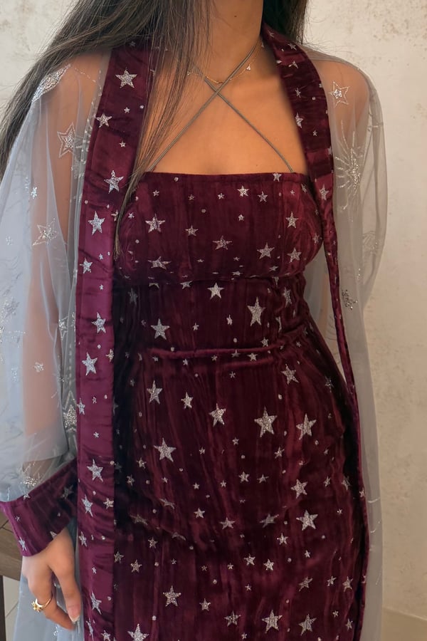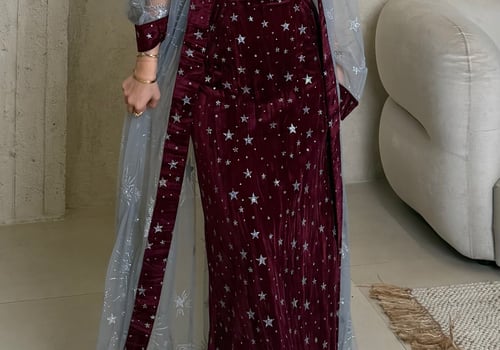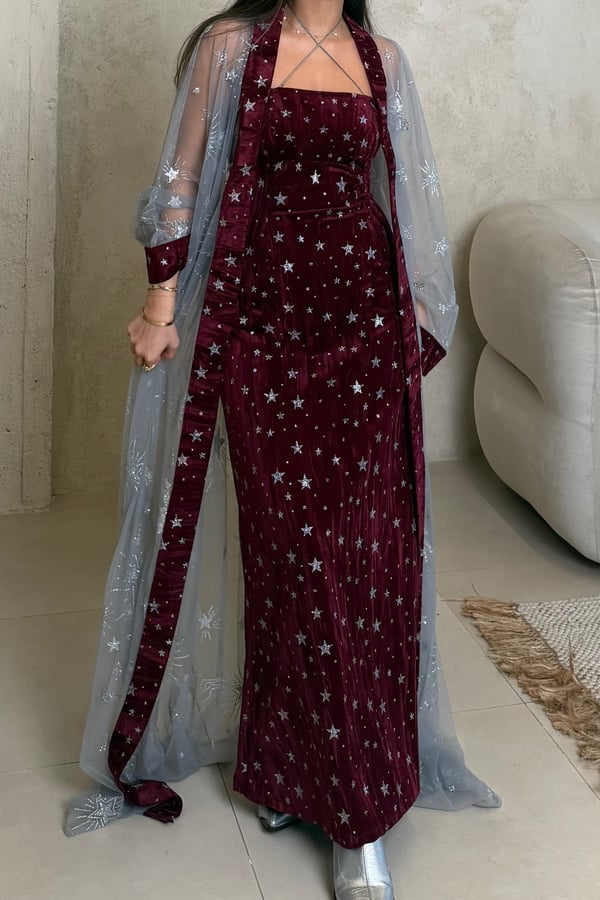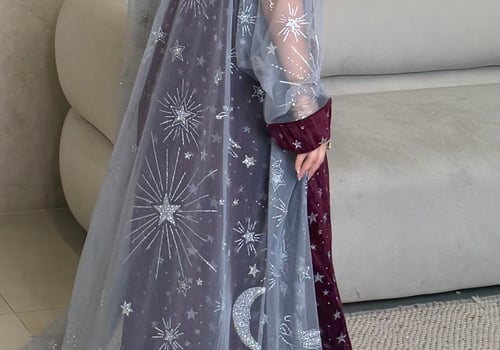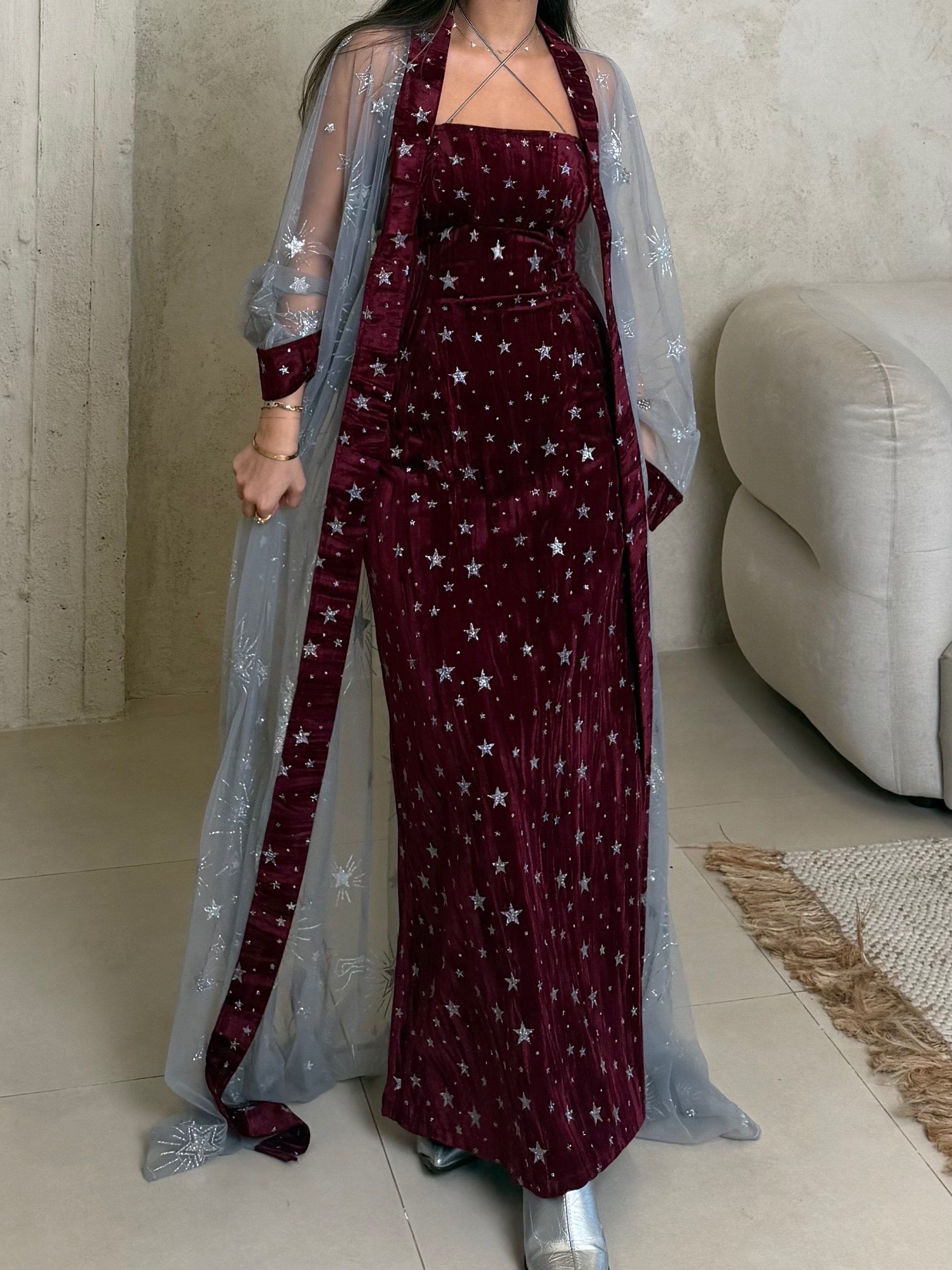 A two piece daraa, a dress and a sheer bisht. The model is wearing a S size. Length can be adjusted.