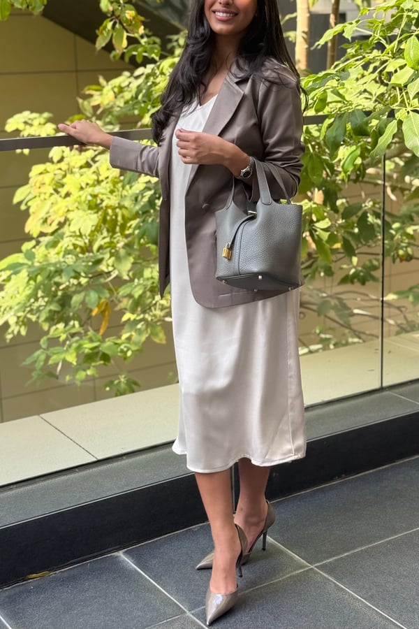 A set of a trench coat fabric blazer and a silk dress. The model is wearing a small size.