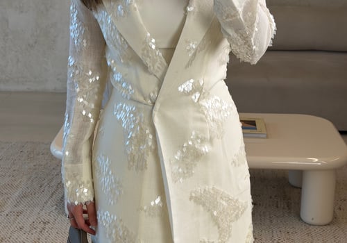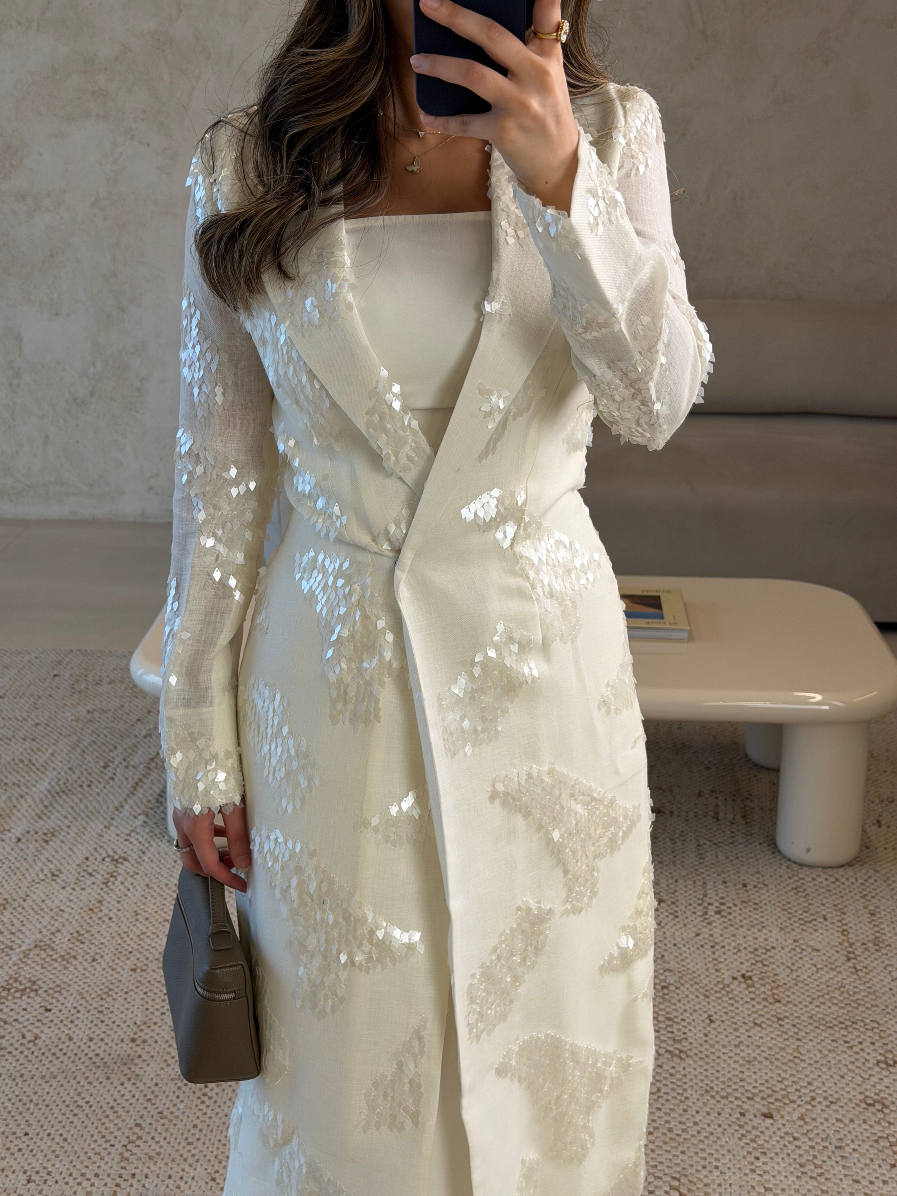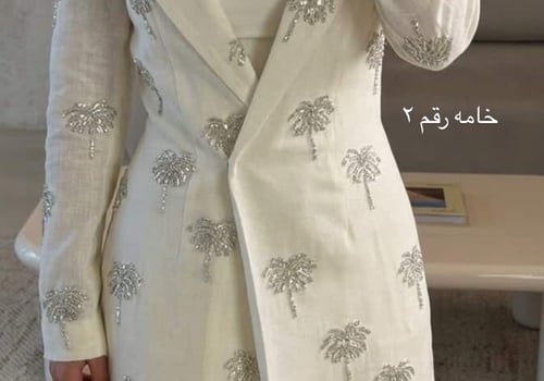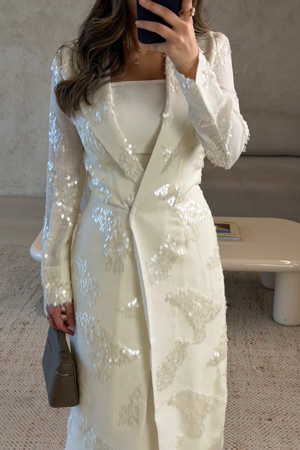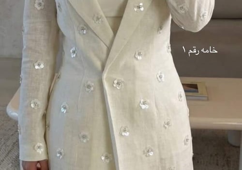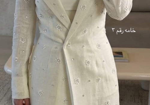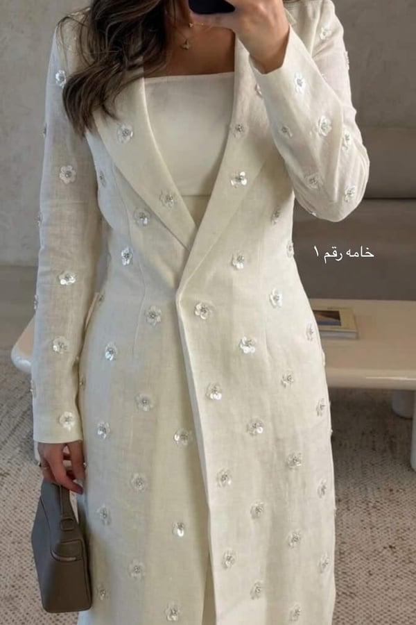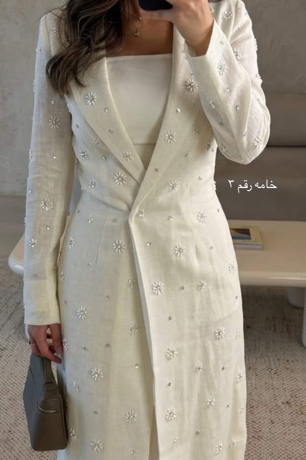 A two piece set. A plain white dress and a long blazer jacket. Model is wearning a small size. Length can be adjusted. The long blazer length is 50. Please note: now using same fabric just new patterns. the exact same fabric, just a similar pattern. as indicated in the pictures. The shell fabric is finished and will not be available due to the suspension of air cargo. Please specify if you want custom made.