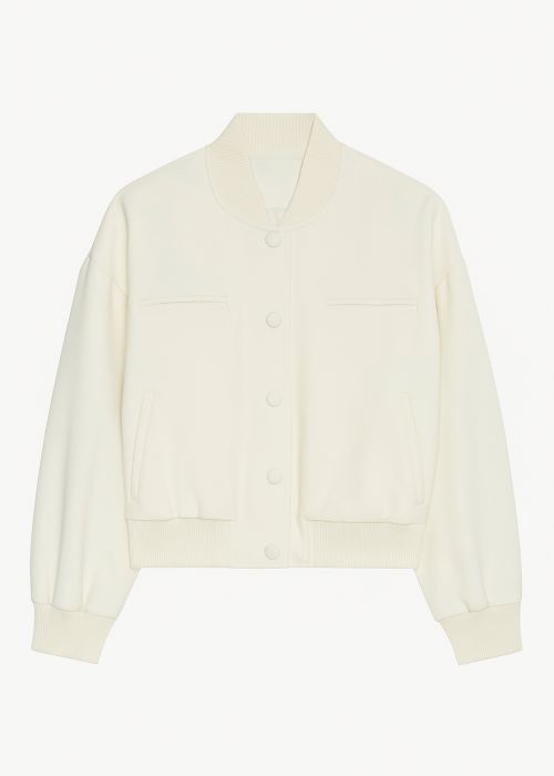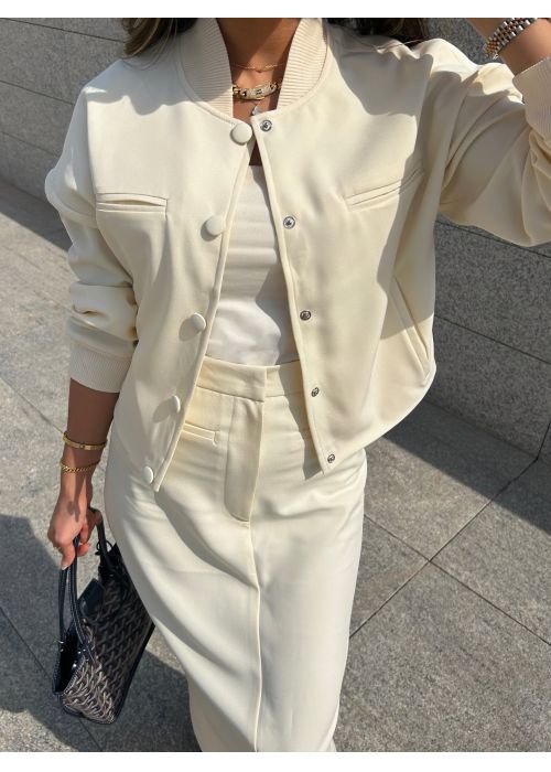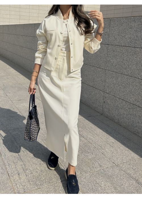 A free size bomber jacket & a skirt set. The model is wearing an XS size. Length can be adjusted.